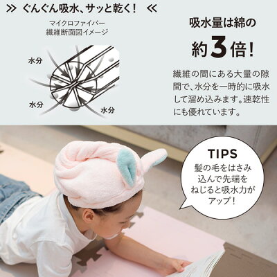 お風呂上りにかぶるだけでマイクロファイバーが濡れた髪の毛の水分をサッと吸水。